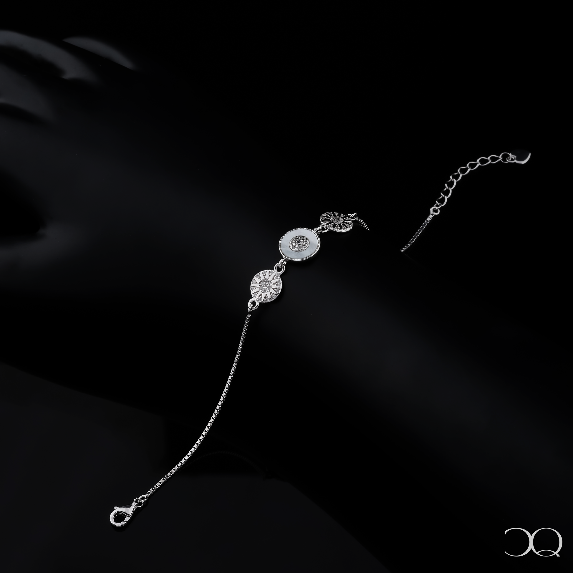 The Celestial Radiance Bracelet – Silver Shine captures the beauty of starlight in a refined silver design. With three intricately detailed circular motifs, including a sparkling center, it exudes timeless charm and effortless sophistication.