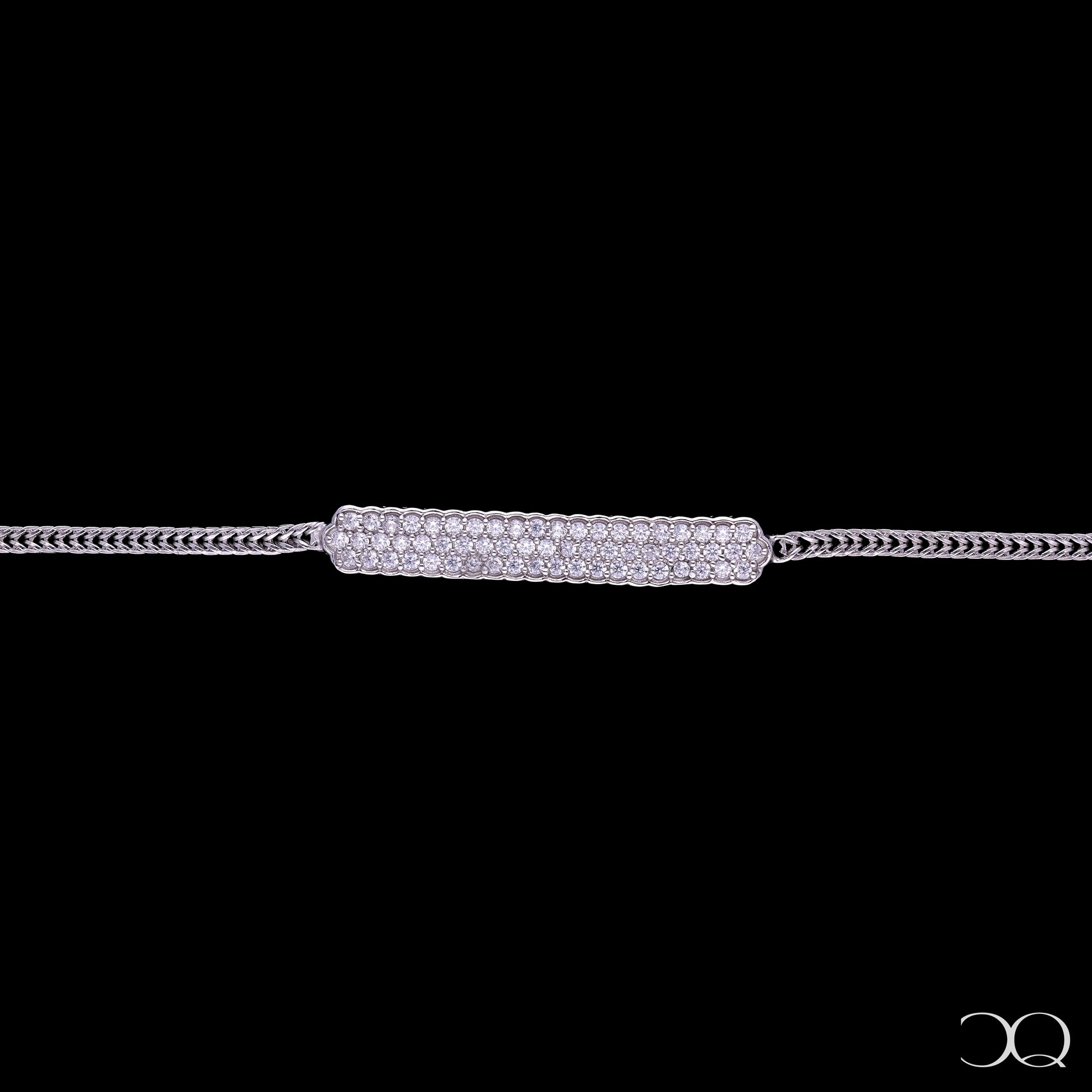 - Design: Paved rectangular bar centerpiece on a high-polish woven chain