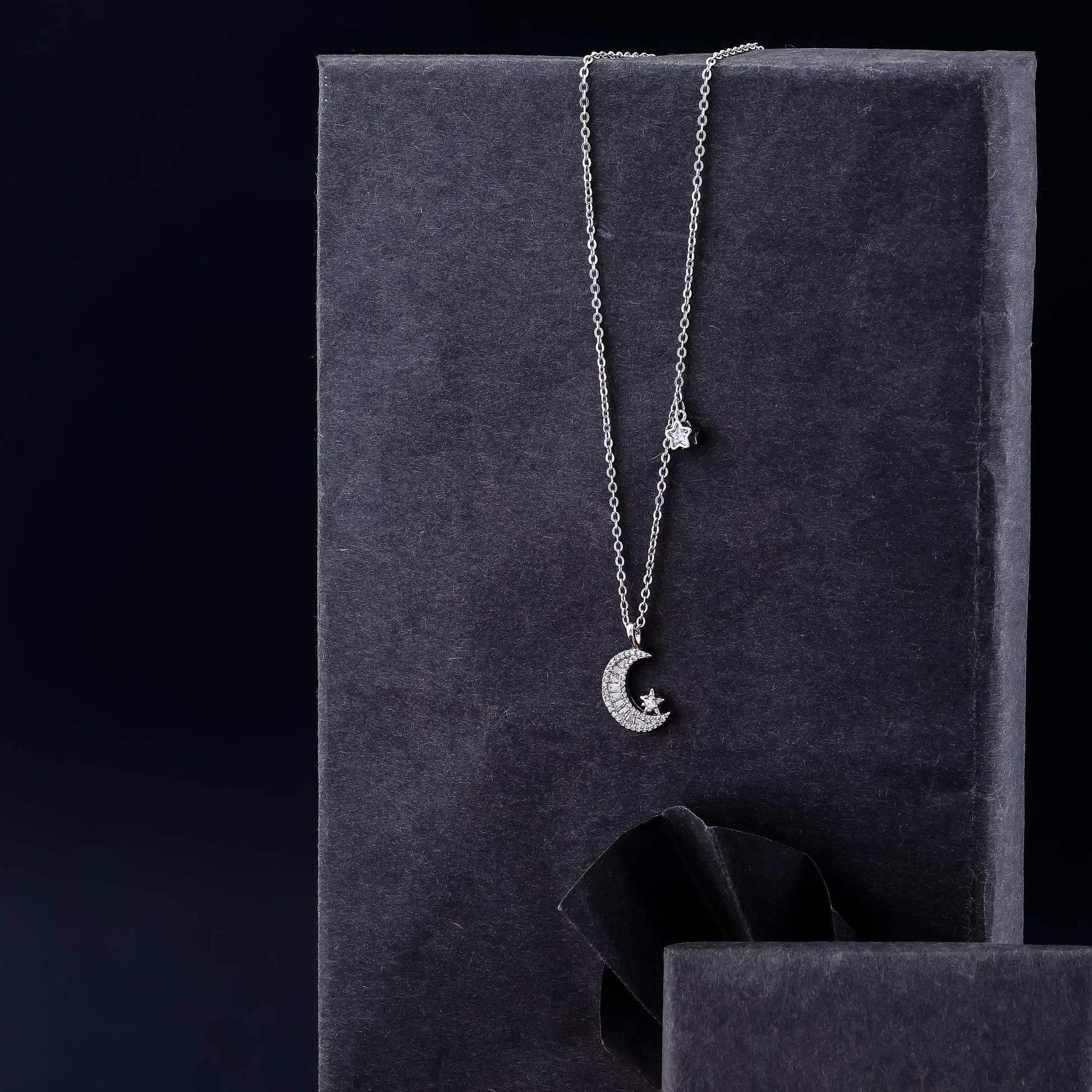 - Design: Crescent moon pendant with baguette + pavé zirconia. Accent star charm for added detail