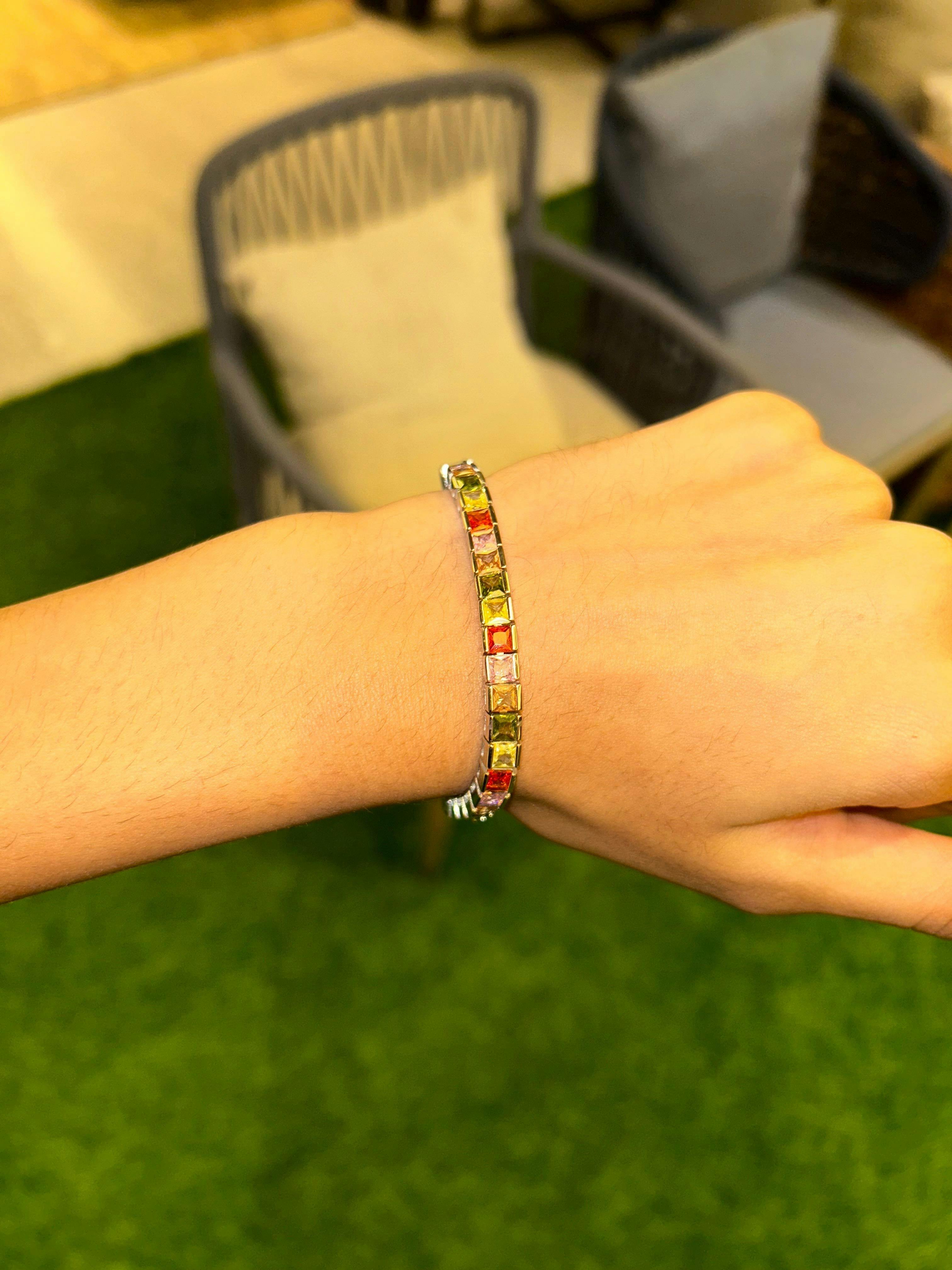 Elevate your elegance with the Prism Radiance Tennis Bracelet, a stunning symphony of color and light. Each meticulously set, square-cut gemstone radiates brilliance in a seamless gradient of hues, creating a timeless statement of luxury. Crafted in premium sterling silver with a flawless finish, this bracelet embodies sophistication and modern artistry — perfect for evening glamour or refined daily wear.