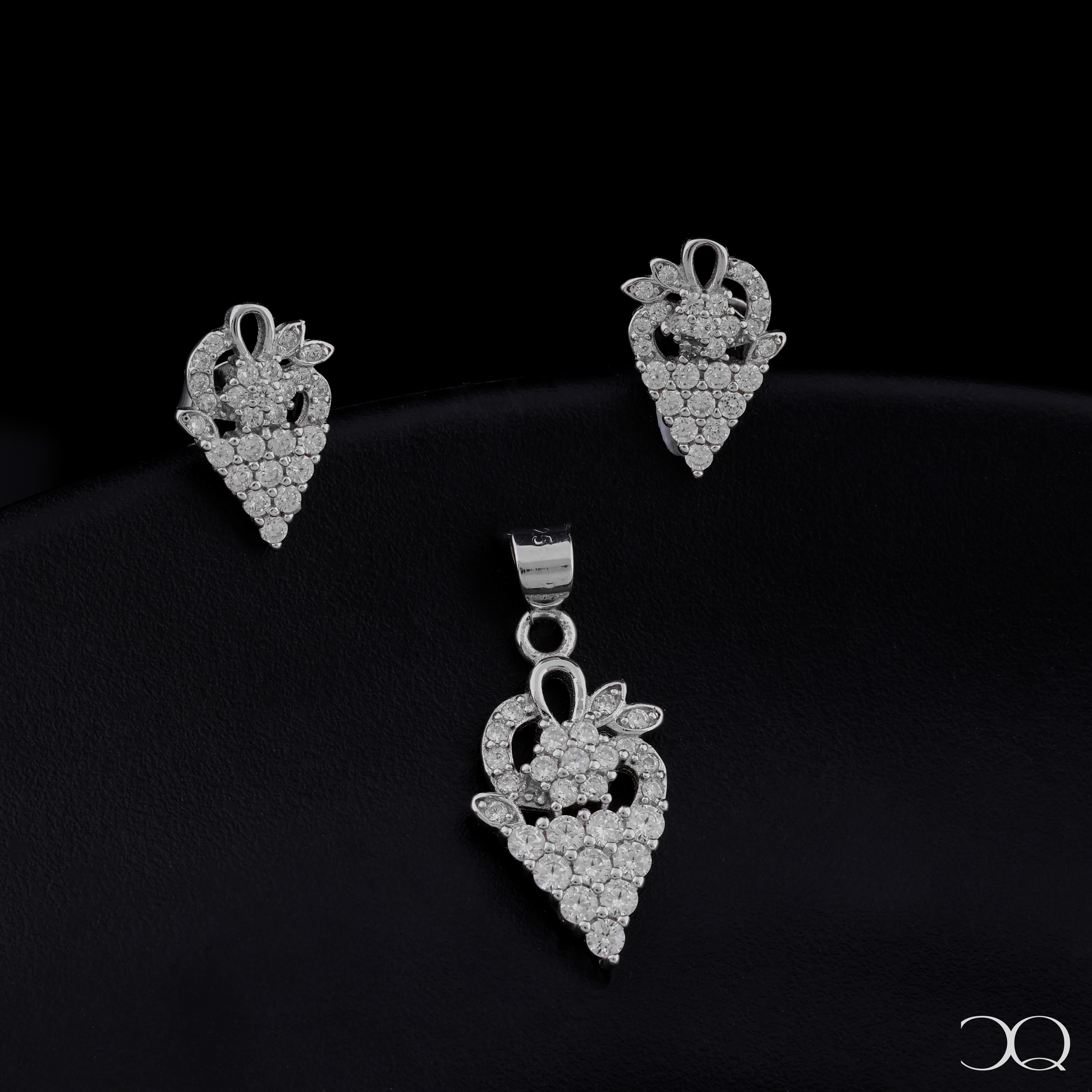 The Radiant Bloom Pendant Set – Silver Crystal Sparkle exudes refined grace and timeless beauty. Designed in sterling silver, this pendant and matching earrings feature a delicate floral-inspired motif, encrusted with fine white crystals that shimmer with every movement. Perfectly balanced between elegance and charm, it’s an effortless choice for both everyday wear and special occasions.