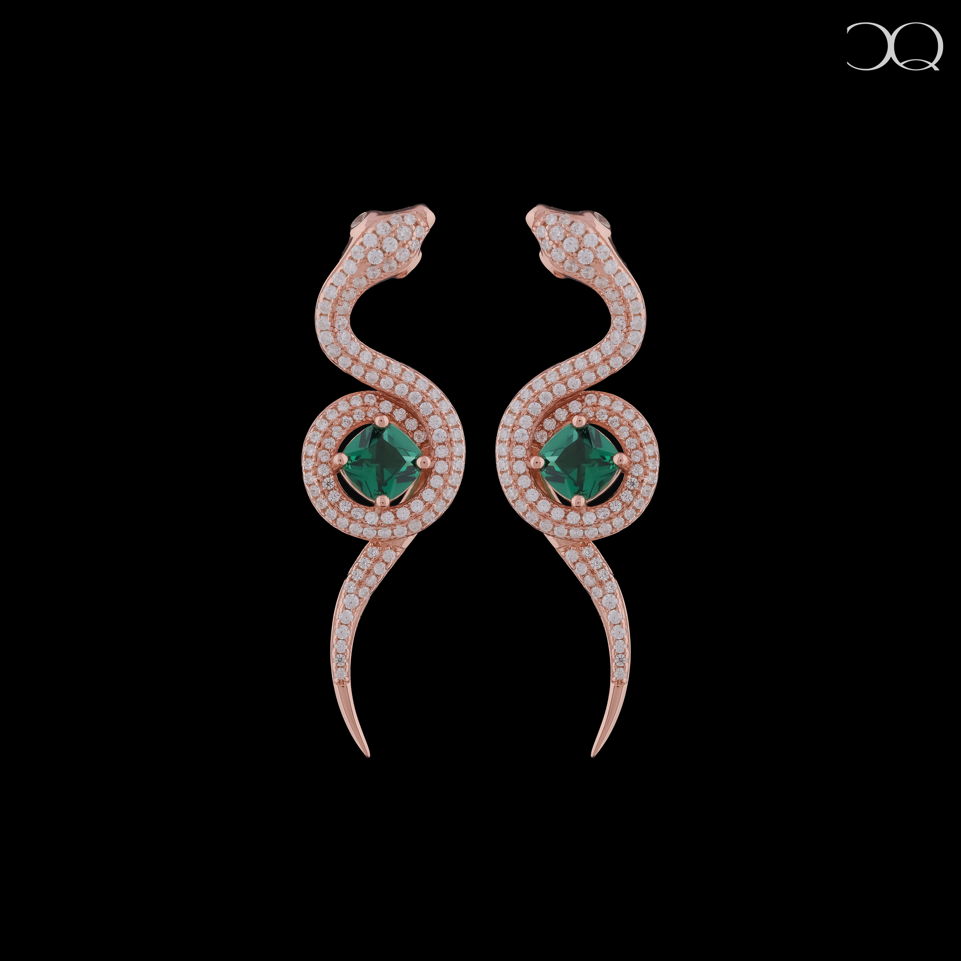 The Serpentine Grace Earrings - Rose Gold with Emerald Accents embody bold sophistication and timeless allure. Expertly crafted in luxurious rose gold, each earring features a fluid serpent-inspired design adorned with sparkling white stones and a striking emerald-green centerpiece. Their sculptural elegance and radiant finish make them the perfect statement piece for evening glamour.