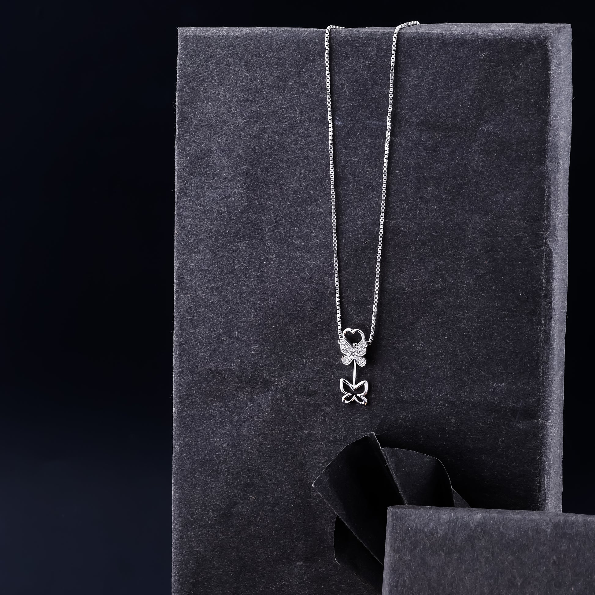 Delicate, dreamy, and full of charm—Whispers of Grace Chain Pendant is where elegance meets whimsy. Featuring a shimmering butterfly design with a heart-shaped cutout and a dainty drop pendant, this necklace is a symbol of transformation and love.